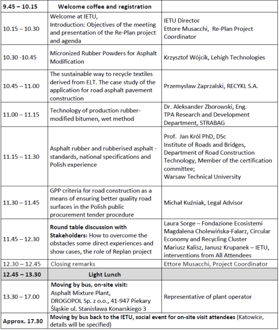 RE-PLAN CITY LIFE project aims to increase awareness on the use of Recycled Tyre Materials (RTMs), promote environmentally friendly behaviors in urban communities, stimulate the adoption of Circular Economy best practices, and create further opportunities of cooperation and implementation through new projects. The meeting will aim to analyse and discuss which actions and initiatives should be adopted in order to stimulate a wider use of rubberised asphalt.