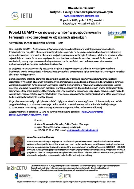 Zaproszenie na otwarte seminarium IETU – Projekt LUMAT – co nowego wniósł w gospodarowanie terenami jako zasobem w obszarach miejskich, Katowice 12.12.2019