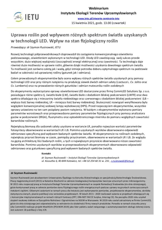 Zaproszenie na webinarium IETU – Uprawa roślin pod wpływem różnych spektrum światła uzyskanych w technologii LED. Wpływ na stan fizjologiczny roślin, 15.04.2021